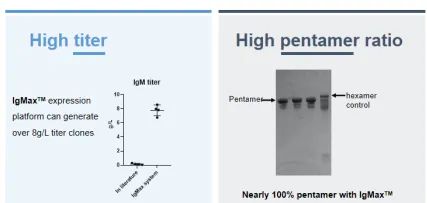 IgM类抗体一般呈五聚体结构,分子量大,糖基化位点多,结构复杂,单克隆细胞株构建和工艺开发难度大。汉腾生物团队在前期的细胞株构建阶段,结合IgM平台专有载体系统筛选优化获得了高产细胞株,产生的五聚体比例可高达100%,几乎无六聚体产生,减少工艺开发难度。